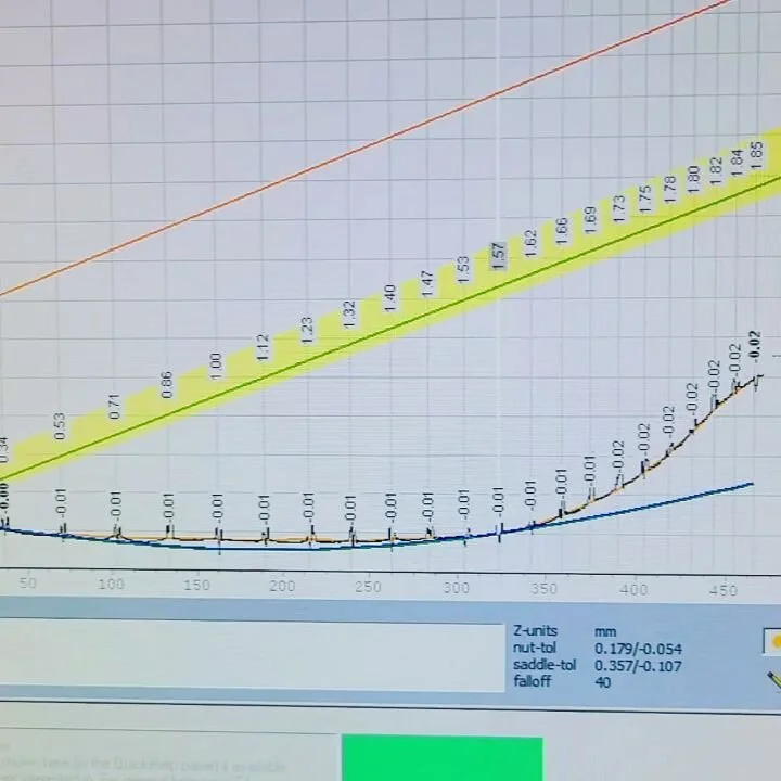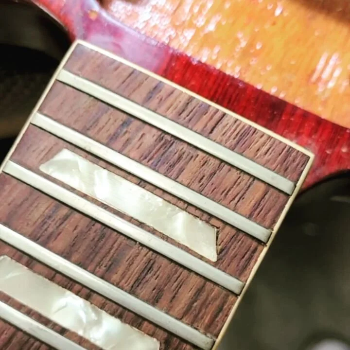 Let us set your guitar up and get it playing better than it ever has. Tight action, eliminate nasty buzzing and dead notes. We can dial in your Floyd Rose or other floating vibrato/tremolo systems. Alternate or Drop tuning, etc... Strobe tuner intonation for great accuracy, Pickups and electronics upgrades, Precision Fret Work